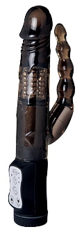 A soft, 2 diretion rotating penis headed shaft is coupled with a 7 mode beaded anal stimulator. A soft touch control panelled base, with bright red indicator lights for night control. This toy is sure to be top of the ass. 3 x AAA batteries |